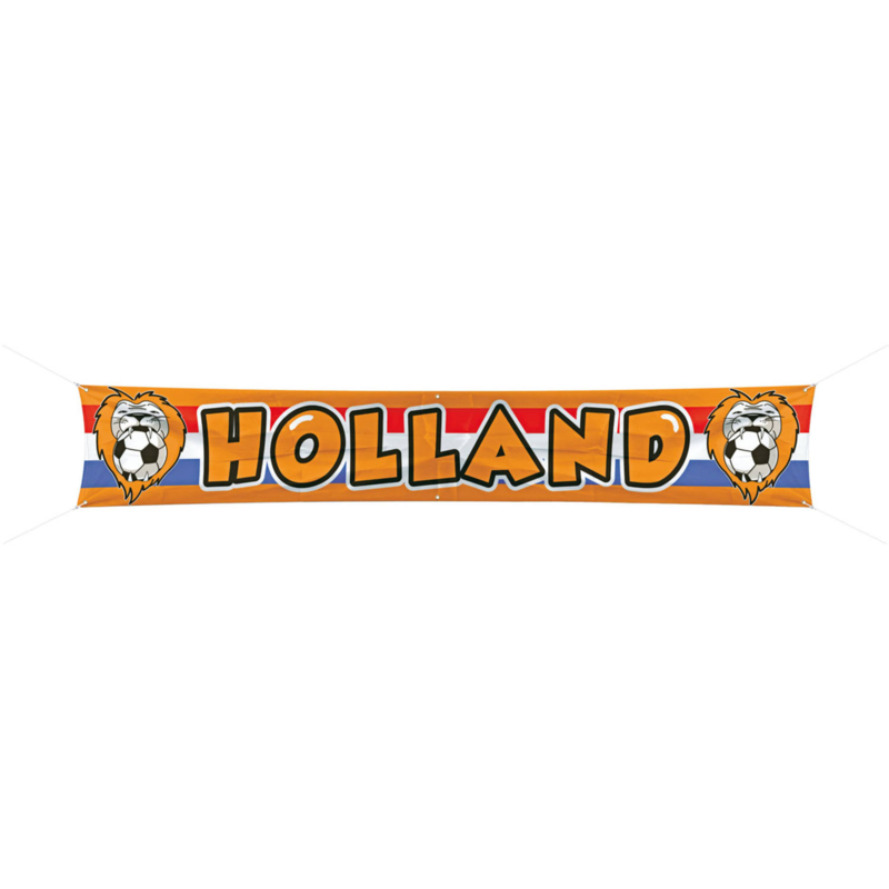 Megagroot spandoek met de tekst: Holland en twee leeuwen met voetbal. Speciaal voor het WK voetbal met oranje! Afmeting is 370x60cm en mteriaal is polyester.