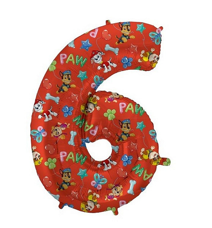 Paw Patrol cijfer 6 folie ballon. Gemakkelijk te vullen met helium zodat de ballon blijft zweven. Ook geschikt om op te blazen met lucht. Leeg bezorgd.